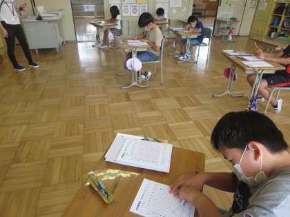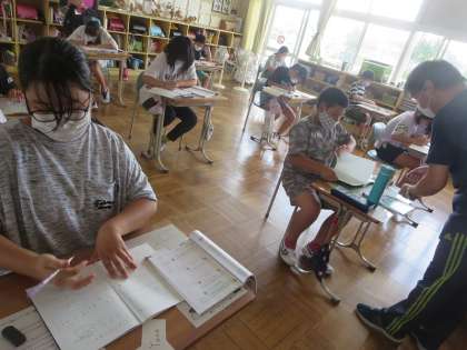 3年生はかけ算の力を高めていくために、九九のタイムチャレンジを行っていました。集中して取り組む表情がよかったです。5年生は、数直線を使った問題に取り組んでいました。数直線から読み取ったり比較したりする力が積み上げています。6年生は、割合の学習です。これまでの学習を生かして、小数や分数の比を分かりやすくしていました。