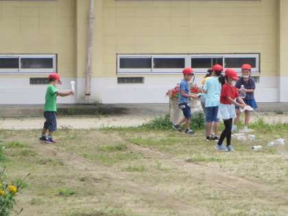 校庭から楽しそうな声が響いてきました。授業中に1年生が遊んでいます…、ではなく、生活科の学習で作った水でっぽうの性能を競い合っていたのでした。人に向けることはせず、的となるペットボトルめがけて「シャーッ」と発射しています。容器を強くしすぎたのか、キャップが外れて「ビシャッ」とこぼしてしまうのも愛らしいです。