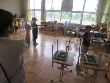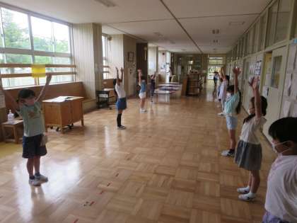 1年生がのびのびした動きを見せるラジオ体操。リードする2年生も責任をもって取り組んでいます。アイアイ体操ではどの学年も目や顔の筋肉のこりをほぐしていました。