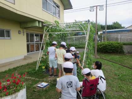 水あげをしたり、伸びたつるの方向を整えたり、そして観察したりと、4年生はがんばっています。どうか実ってくれますように…。
