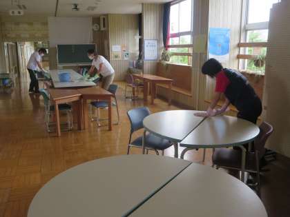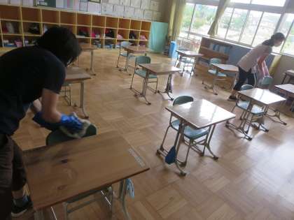 午後4時過ぎから消毒・水拭き作業を行いました。1学期授業日も残り6日です。当たり前の一日を大切にしていきます。