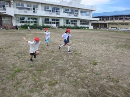 1年生が元気に走りだしました。水曜日のお昼休み、待ちに待った自由遊びの時間の始まりです。