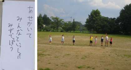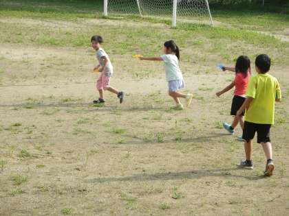やや気温が下がってきた午後4時ころ。校庭からセミの合唱に負けない元気な声が聞こえてきました。児童クラブの子どもたちですね。