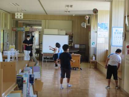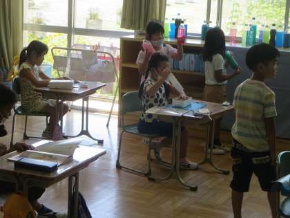 10時前の校庭。暑さ指数計で測定したら31度超えの「危険」レベルに…。そこで、休み時間は校庭での活動はせず、室内で過ごすよう放送を入れました。帽子をかぶり水筒を持って元気に校庭に向かおうとしていた1年生は教室でお絵描きや粘土遊びを。また、2・3年生はワークスペースで昔の遊びをして友達とのひとときを過ごしていましたね。