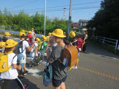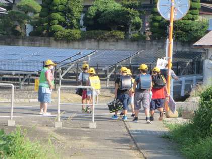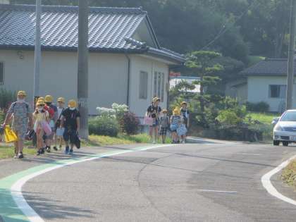 熱中症の危険が特に高くなっていることから、登下校時にはマスクを外しています。会話はひかえ、一列で登校してくる姿が見られました。「おはようございます」とハンカチを口に当ててあいさつする6年生の態度が立派です。