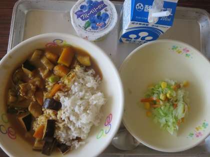 夏野菜のカレーライス、牛乳、フレンチサラダ、ブルーベリーゼリーでした。