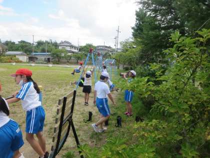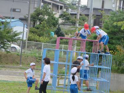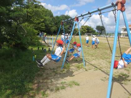 高学年の体育の授業が続いていたので、じゃまをしないようにと、遊具のところで遊ぶ1〜4年生でありました。でも、ブランコで遊んでいた1年生は砂場の6年生が気になるようで…。(つづく)