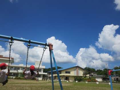 ブランコの1年生が空を見上げ、楽しげにお話しています。