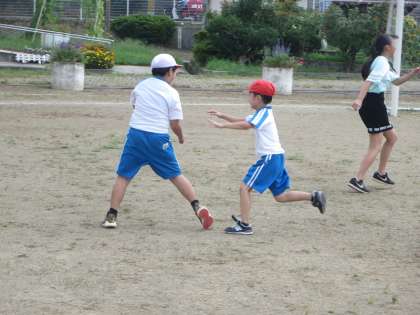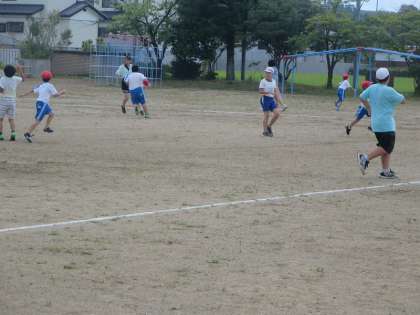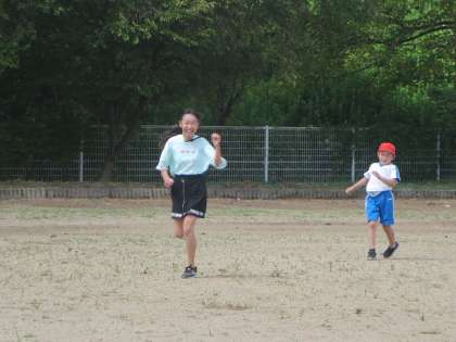 やっぱり1年生はハンターとなって上級生を追いかけたいのです。3〜6年生は悲鳴を上げながら、1年生から逃げ回っていました。でも、上級生も楽しんでいるように見えますよ。
