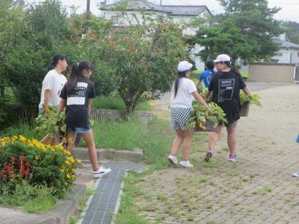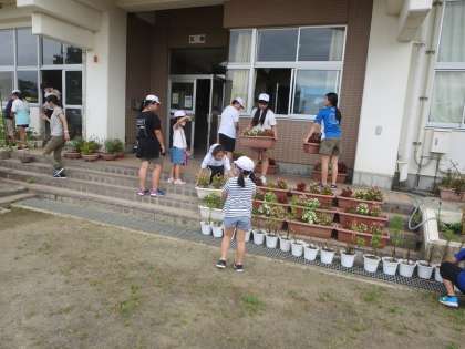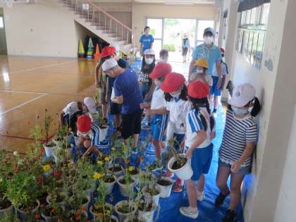 高学年の子どもたちがよく動きます。近くでは下級生たちがその姿を見ています。そして、お手伝いを始めます。