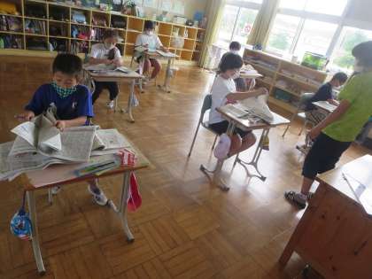 先週金曜日からスタートした新聞ウィーク。新聞を読み、友達と交流することで物事を多面的・多角的にとらえることができるようにするのがねらいです。導入期の1年生は、紙面からカタカナを見つけ出すことで新聞に親しむ機会としています。