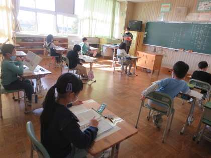 4年生は説明文の学習。ことばに気を付けながら説明文を読み返し、気付いたこと・考えたことなどを話し合いながら、筆者の言いたいことを読み取っていきました。