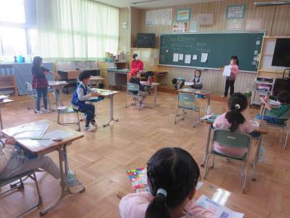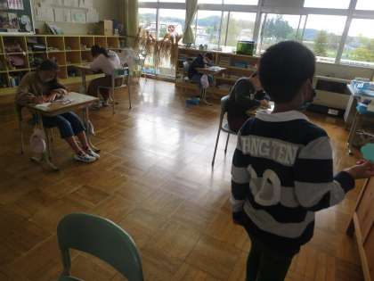 1年生の図画工作は鑑賞する題材です。自分が取り組んだこすり出しについて、作品を示しながら一所懸命に説明する姿が見られました。