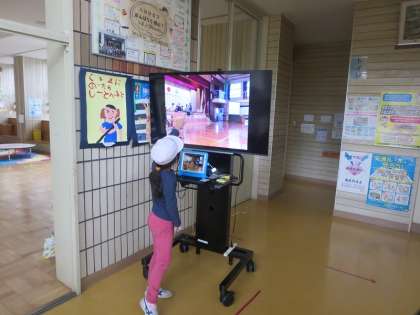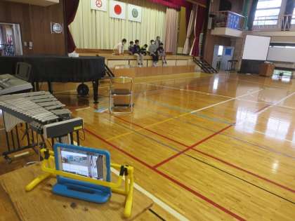 児童昇降口ホールに設置したテレビ。その画像を興味深げに見入っている子どもがいます。今回の小泉フェスタは感染予防のためお家の方限定公開としました。そこで、待機中の子どもたちに体育館の様子をオンラインでみることができるようにしたいと考え、準備してみたのでした。うまくいきますように…。