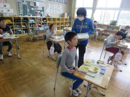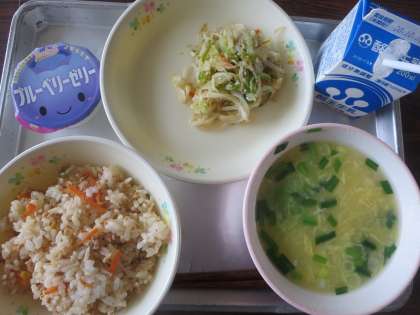 キムチチャーハン、牛乳、春雨のごま酢あえ、中華卵スープ、ブルーベリーゼリーでした。