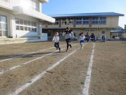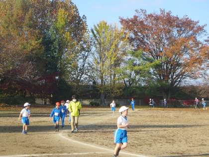 朝の校庭。明るい日差しの下、輝く青空や色づいた木々の葉を見ながら走るのは気持ちよいです。そして、がんばって走る友達の姿があるから、自分もがんばって走ろうという気持ちがわくのですね。50m走では、6年生が下級生に声をかけ一緒に走ってくれています。ありがとう。