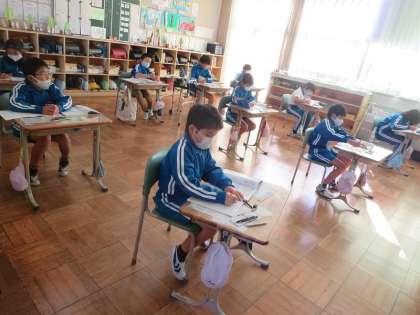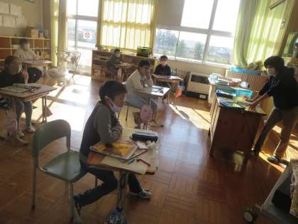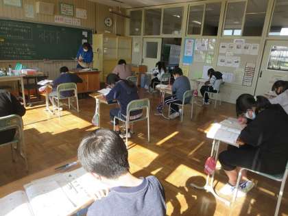 落ち着いて学習している校舎2階の4〜6年生。ノートの上の鉛筆が止まらないのは、書き写そうとしたり考えを書き表そうとしたりする学習への思いが強い証拠ですね。先生や映像を見つめる瞳にも学習に向かおうとする意欲が表れていました。