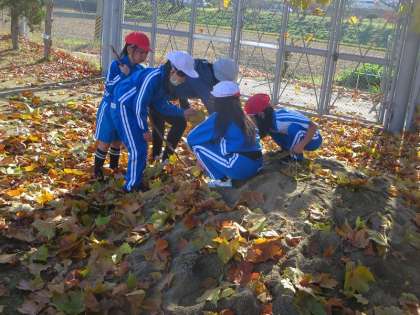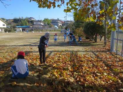 ここ数日で落葉が一気に進んだ校庭。色とりどりの落ち葉は、子どもたちの好奇心をくすぐる魔法のアイテムです。最初は落ち葉集めだったのに、次第にアイディアが浮かんできた1年生。小さな砂山の上で、落ち葉レストランを開店しました。そこへ先生、同級生が少しずつ加わっていき、小さな落ち葉レストランの物語が作られていったのです。