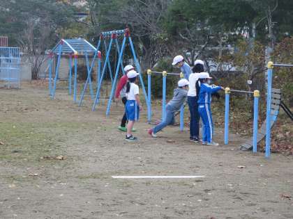 休み時間はお日さまが隠れてしまい、それだけで外へ出るのがおっくうになってしまいます。でも、1〜4年生が元気に遊んでいるので、その姿に誘われて校庭に出てみました。くもり空ですが、校舎内よりあたたかいのにびっくり。サッカーや遊具遊び、鬼ごっこなどを友達や先生と一緒に楽しんでいる小泉っ子に今日も元気をもらいました。