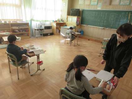 2年生は、冬を感じるものをカードに書いていました。お正月やクリスマスなどの行事、みかんやおもちなどの食べ物、雪や氷などの自然…。これまでに経験したことを振り返りながら楽しそうに書いていましたね。