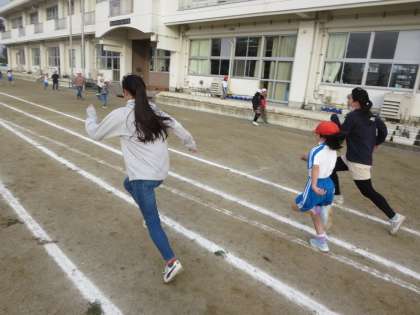 朝の運動。先生たちの声かけ効果で低学年の子どもたちの準備がすばやくなり、元気に校庭をかける姿が増えてきました。6年生を始め、上級生が気を配って50m走を行うようになったのもうれしいです。
