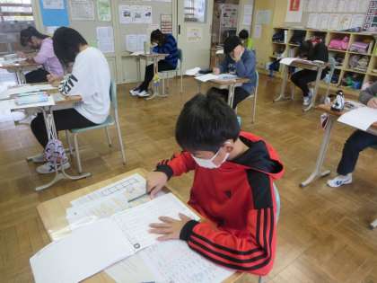 朝の算数タイム。6年教室は10分間の学習に集中しています。この姿をお手本として、全校が落ち着いて学習に向かうことができるようにしたい。そう願っています。