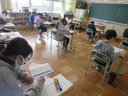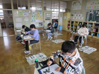 文字の配列や漢字の組み立て方、点画のつながりなど、自分が気を付けたいことを意識しながら取り組む5・6年生であります。また、鉛筆の持ち方や姿勢などにも注意を払うひとときとなりました。