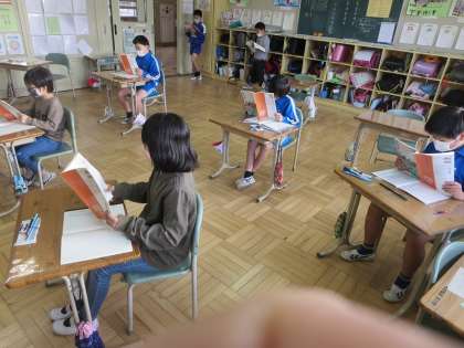 3年生が教室で熱心に唱えていたもの。教科書に掲載されている「ゆき」という詩でした。声に出して一人じっくりと読むことは「初雪」「粉雪」「ドカ雪」など、いろいろな雪の名前を知るだけでなく、その景色(場面)を想像することをうながす効果があると考えています。知識を広げ、情緒を育むためにも、大切にしたい学習です。