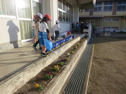今朝は3年生が校庭に出てくるのが早く、たくさん周数を重ねていました。50m走ではこれまでの6年生の姿を見てきた影響で、2度、3度とチャレンジする子どもたちが増えてきています。パンジーやビオラ、菜の花への水あげにも進んで取り組む姿が見られ、気持ちのよい朝でした。