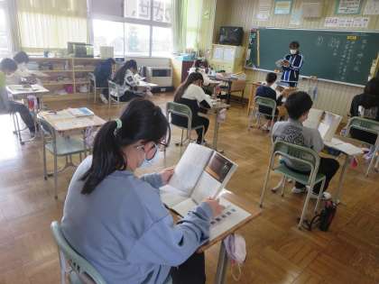 範読CDを聞きながら教科書の文を目で追っています。独特のせりふ回しがありますので、まずはじっくりと聞いているようです。その表現をまねして、自分の声で語る姿が楽しみです。