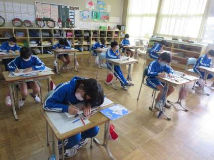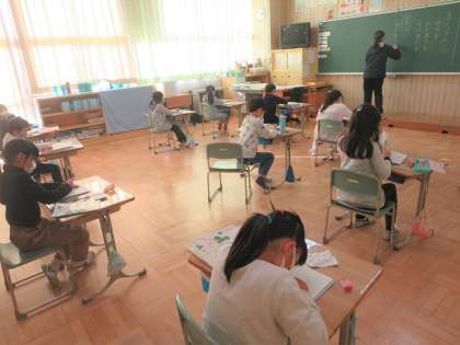 1年生は「むかしばなし」の学習です。特に自分が気に入った場面について、登場人物の言動にふれながら自分の思いをノートに書き出していました。文に書き表す力が一日一日と高まってきていますね。