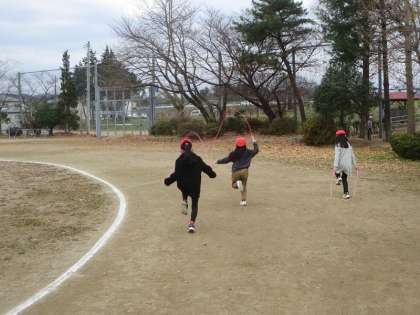 かけ足跳びで元気に校庭をかける1年生。楽しい休み時間の始まりです。南側の林や遊具付近では、子どもたちが思い思いに楽しいひとときを送っています。