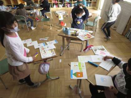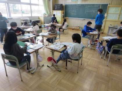 2年生は、紙のつなぎ方を工夫してお話を絵で表す学習です。一枚の絵から始まり、それをどう発展させていくのか、2年生自身がわくわくしながら取り組んでいるのがいいですね。