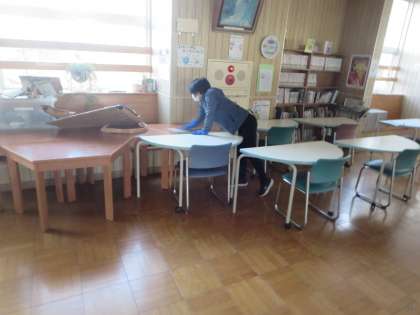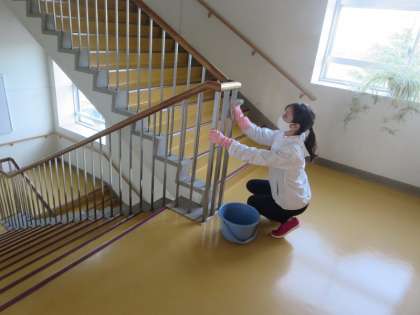 子どもたちが下校したあと、共有部分の消毒作業を行いました。