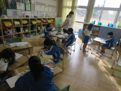 1年生は、自分のお店で取り扱う商品の名前やイラストをカードにかいていきました。友達に紹介したいという思いが、ていねいな字やきれいなイラストに表れていますね。