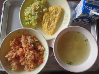 チキンライス、牛乳、チーズオムレツ、ハムサラダ、野菜スープでした。