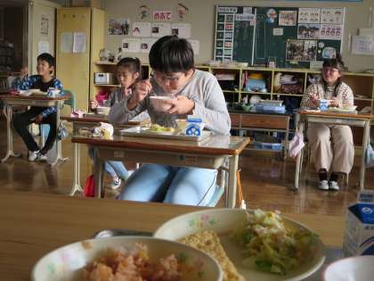 うれしそうにチキンライスを口に運び、その余韻が消えないうちに、オムレツやサラダを一口ずつほおばり、スープを…。これは、ゆっくりと食している子の様子です。実においしそうに食べるなあ、そう感心して見入ってしまいました。