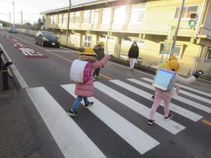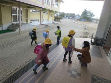 くもり空で気温1度。じんわりと冷える朝です。登校するときの小泉っ子の服装は、すっかり冬の装いですね。寒いけど、1列になって歩き、地域の方々にあいさつする子どもたちに拍手!