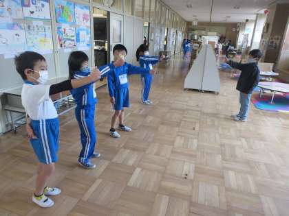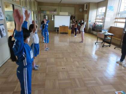 火曜日朝のさわやかタイム。ラジオ体操でからだを伸ばし、アイアイ体操で目のコリをほぐしていく小泉っ子であります。このとき教職員も音楽に合わせてからだのメンテナンスをしています。貴重な時間なのです。