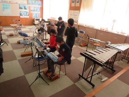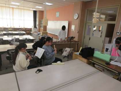 6年生が合奏題材に取り組んでいます。グループごとの課題から拍に合わせる、音をきれいに重ねるなどの活動が進められていました。少しずつ少しずつ進んでいきたいです。