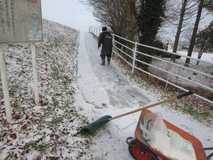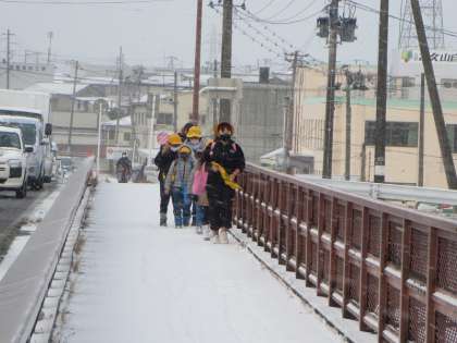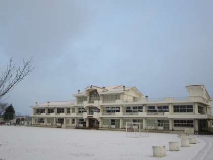 校庭一面にうっすらと降り積もった雪。用務員の先生が学校付近の通学路に融雪剤をまいたり雪かきをしたりしている頃、小泉っ子が登校してきました。