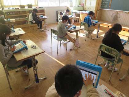 タブレットドリルを使って、学んだことを確かめていきました。タブレットドリルは自分の理解度やペースに合わせて使うことができるすぐれものです。いま苦手なことは?正確に解くためには?など、自分の現状に気付かせながら、やり遂げる力を身につけさせたいと考えています。
