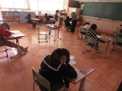 生活科カードに集中していたのは1年生。校庭の雪で遊んで感じたことを絵と文でかき表していたのです。気付きや思いを確かめているかのように、じっくりとカードに向かう1年生でありました。