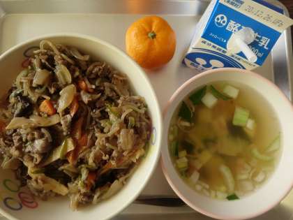 焼き肉丼、牛乳、中華スープ、みかんでした。