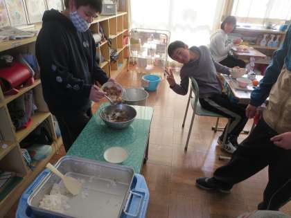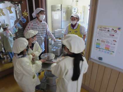 うれしそうに給食室から運搬していく子どもたち。いつもと同じ時間帯に教室を訪問すると、食べ終えている子やあと数口の子たちでありました。ほんとうにおいしくて、食が進んだそうです。食べている様子はあきらめ、お代わりしているところをパチリ。