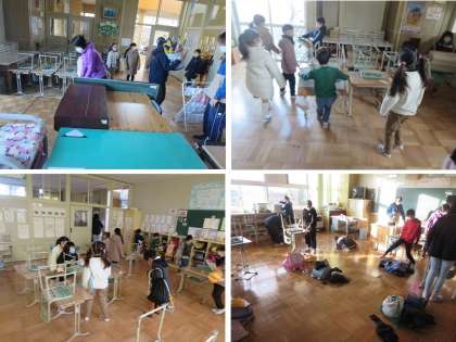 今朝はワークスペースに運び出した机やいす、電子オルガンなどを教室内に運び入れなければなりません。こういうときに頼りになるのが6年生です。1階の下学年の運搬作業を手伝い、それから自分たちの教室へ。朝から、一緒に、一所懸命な小泉っ子の姿が見られました。