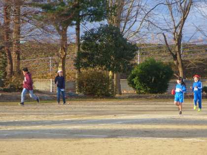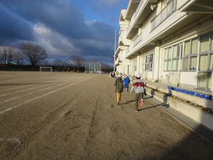 朝は運搬作業があったので、校庭を走るのは実施しません…のはずでしたが、「1分でも、1周でもいいから走りたいです」という子どもたちのため「OK!」としました。2分弱の短い時間でしたが、20名ほどの子どもたちの気持ちよく走る姿が校庭にありました。