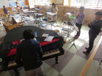 5年生の音楽。先生と子どもたちが一緒になって音楽を作り上げていこうとする姿が見られます。各パートの音の重なりを意識した合奏となってきましたね。