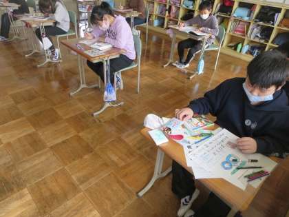 6年生の国語。冬を読んだ短歌・俳句ができあがり、それぞれが短冊に清書しています。ていねいな文字に加え、背景やイラストなどが作品に合っていてすてきですね。