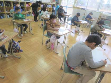 2・3年教室では、作文を書いていました。「わたしは小泉さんの消しゴム」というように、自分が消しゴムだったらどんなことを思うかな?という設定で取り組んでいました。書いたものを読むと子どもの発想ってすごいなあって思いますよ。